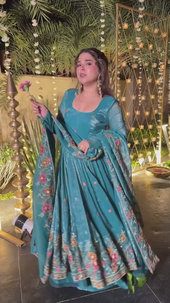 "Designer Chinon Silk Anarkali Gown with Elegant Dupatta and Heavy Embroidery Work"