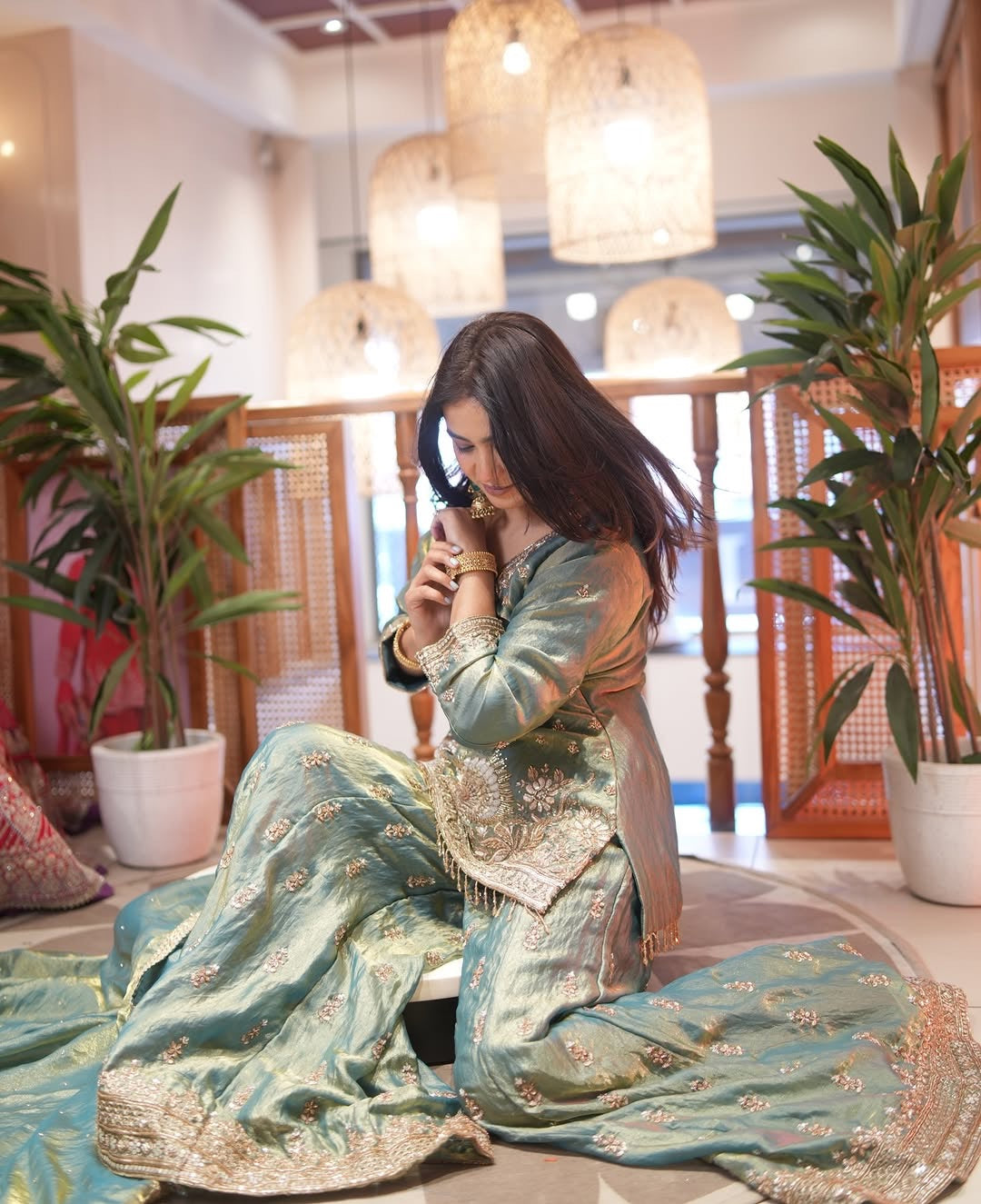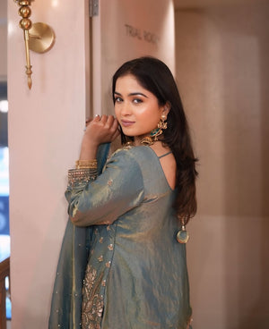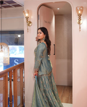 A premium Eid special sharara set crafted in pure Fendy silk, featuring heavy embroidery sequence work for a rich festive look. Designed with a fully stitched top with full sleeves, matching embroidered sharara pant with elastic waist, and an elegant dupatta finished with fancy lace border, this set is perfect for celebrations with a classy ready-to-wear finish.