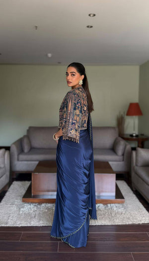 A stylish ready-to-wear lehenga saree set designed in premium Chinon silk, featuring a beautifully embroidered jacket/koti with zari and thread work. The look is completed with a plain blouse and an elegant lehenga saree finished with fancy samosa lace on the pallu—perfect for festive and party occasions.