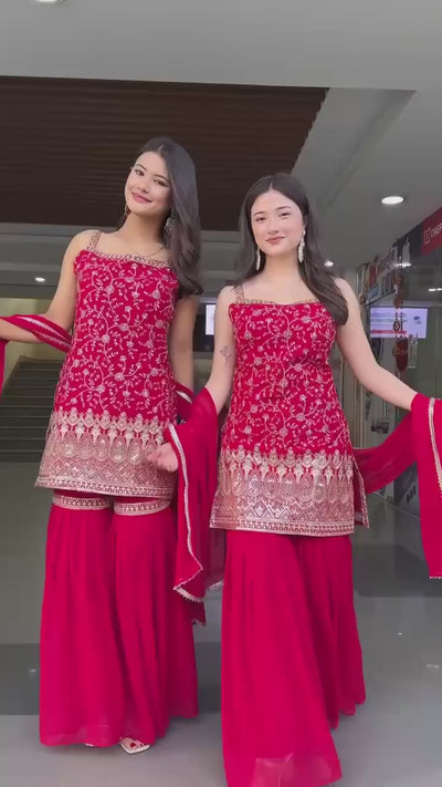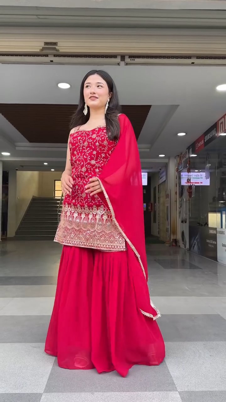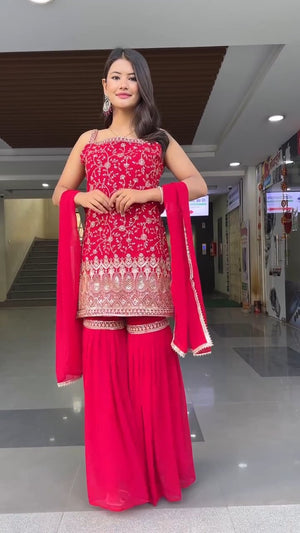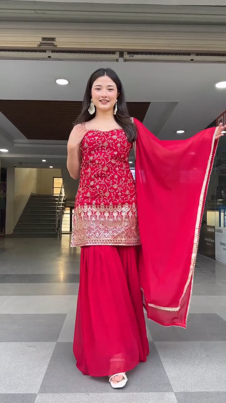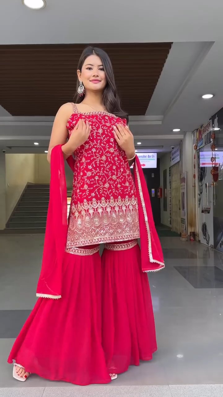 This elegant sharara suit set features a beautifully embroidered straight-cut kurti with intricate thread and sequin work that adds a graceful festive charm.