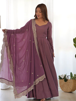 Mauve Chanderi Silk Anarkali Gown With Pant & Dupatta Set
