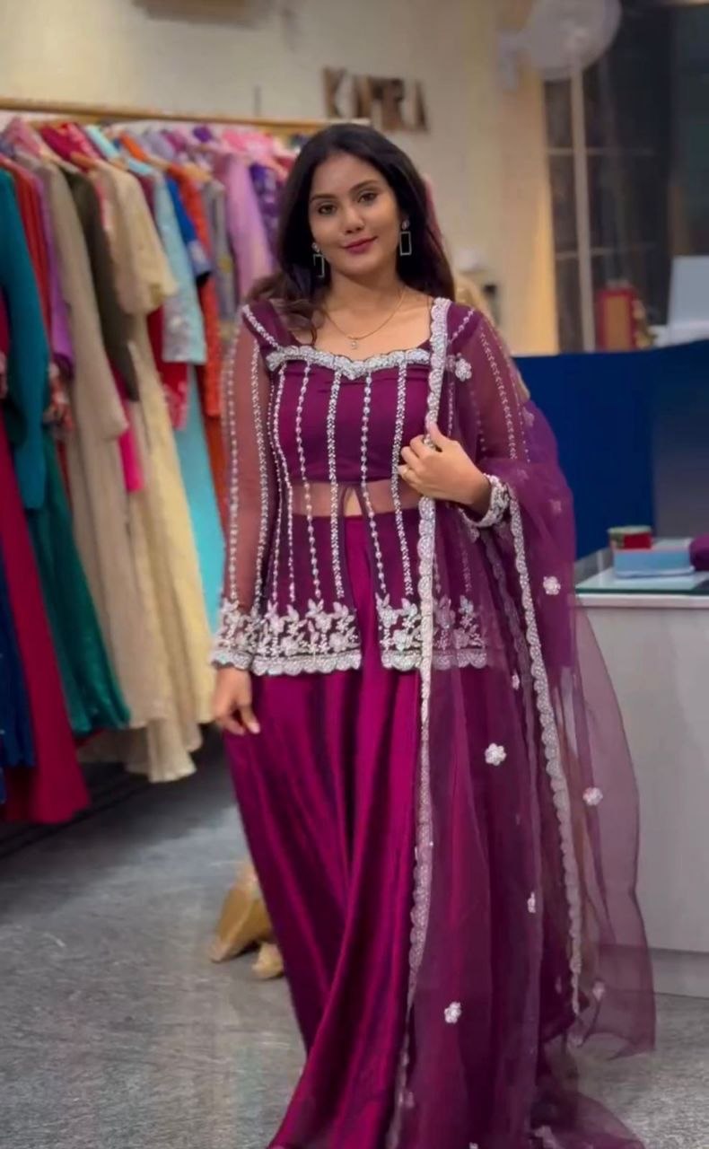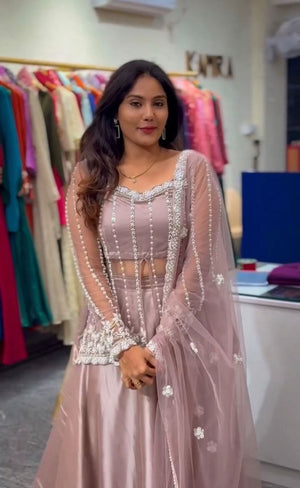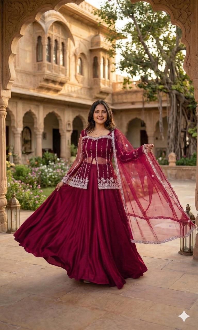 A statement festive ensemble featuring a flowing Rangoli silk lehenga paired with an intricately embroidered koti, designed for a graceful and modern ethnic look.