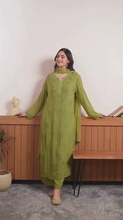 Elevate your ethnic wardrobe with this premium Faux Georgette Kurta Palazzo Set, beautifully designed with intricate thread embroidery that adds a touch of elegance and sophistication.