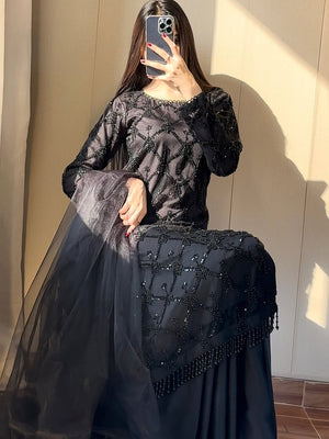 A stunning designer partywear 3-piece set featuring a heavy soft net embroidered top with sequins, fancy pearl moti work, and lace border detailing. Paired with a comfortable heavy French crepe plazzo and a matching soft net dupatta with elegant lace border for a complete premium festive look.